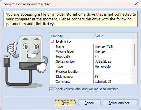If the drive isn't connected to your computer, before starting the process WinCatalog will ask you to connect the drive: