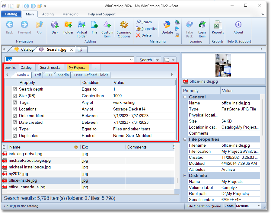 The additional search options are located below the search field. It contains the "Look in" filter and tabs with basic and specific fields: