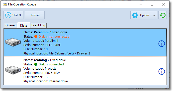 Check everything twice and click Start All when you're ready. The File Operation Queue will be processed: WinCatalog will try to process entries from the connected disks, then it will display a prompt to connect missing disks and will start over until the Queue contains any entries without errors or until you stop the processing by clicking the Cancel button in the progress window.