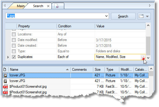 Click Search when done. WinCatalog will find all the files that match the query (*.jpg on the picture above) and then it will filter the results to show only the files where the selected fields (Name, Modified Date, and Size on the picture above) are the same.