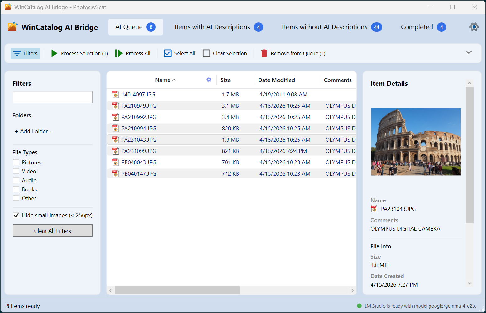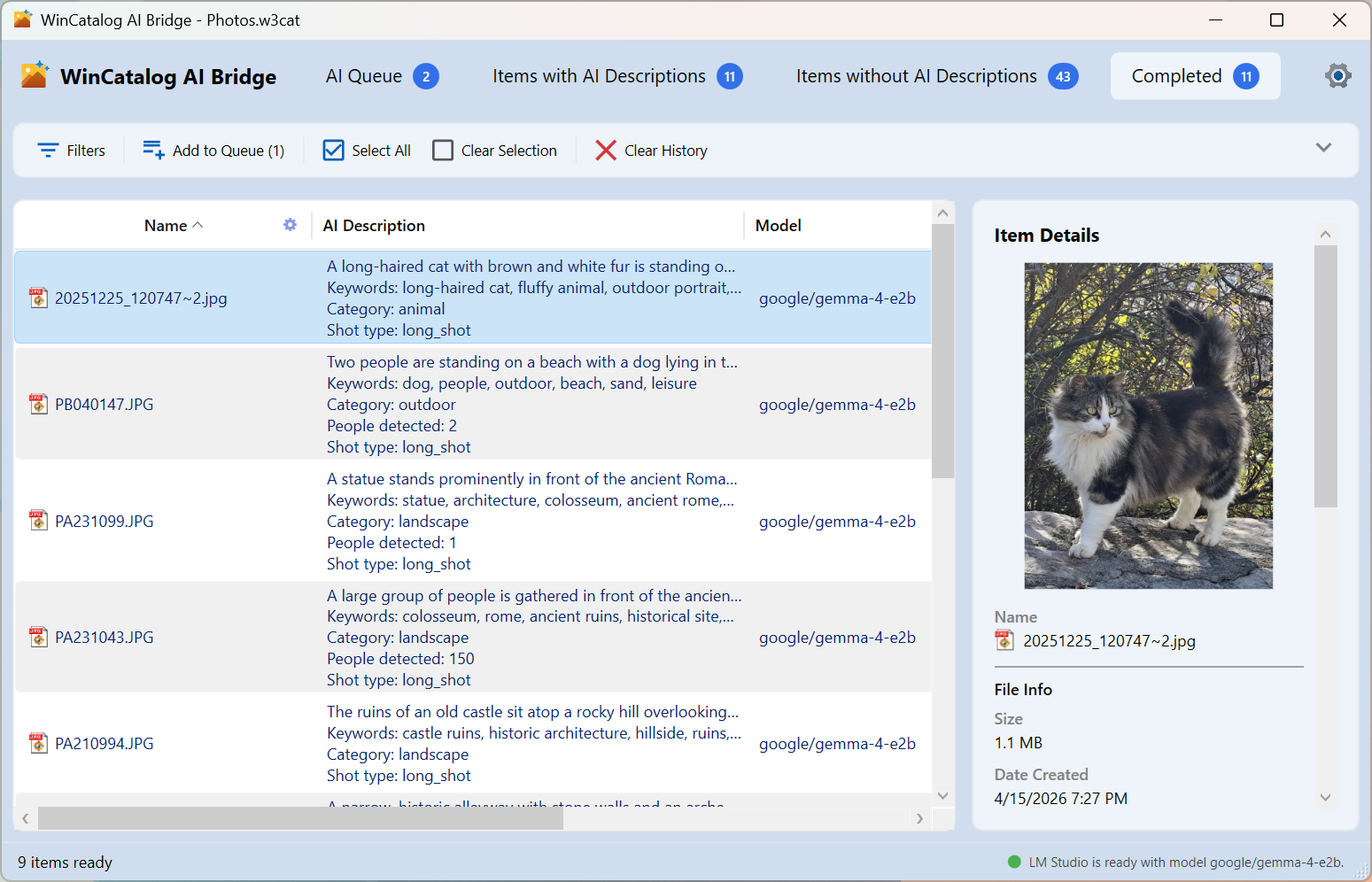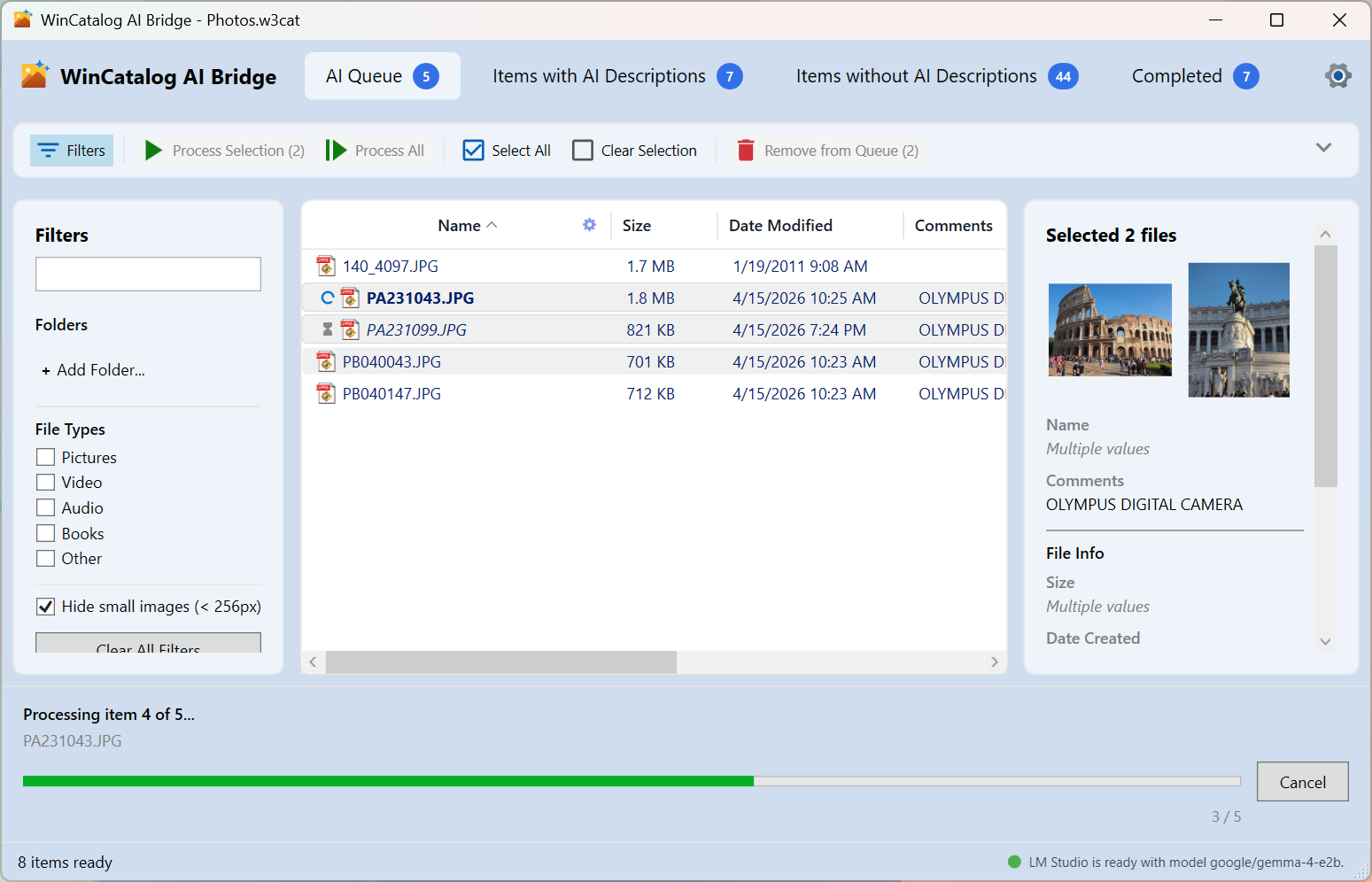 For large collections, processing can take a significant amount of time depending on your hardware and the AI model used. On an average laptop with GPU processing takes 2-5 seconds per image. You can cancel at any time and resume later — items that were not yet processed remain in the queue.