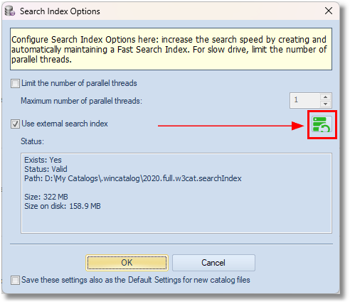 Please run WinCatalog, click the Catalog button (left from the Main tab of the Ribbon toolbar), then click the Search Index button. The Search Index Options window will appear. Click the button with the green icon next to the "Use external search index":