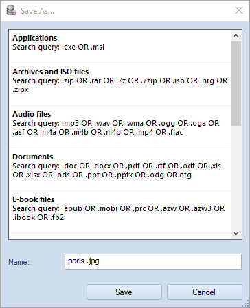 To save the current search configuration, click the Save As... menu entry in the dropdown menu of the Save button. The Save As... prompt will appear.