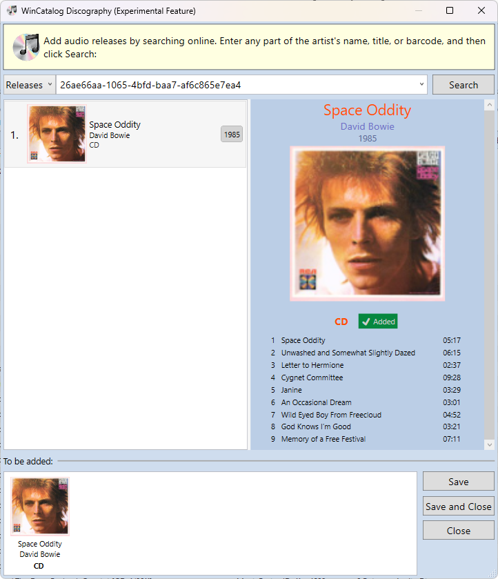 Select Audio Release on the left and inspect the details on the right. All media associated with the Release will be listed on the right pane. Click the Add button to add the correspondent media to the catalog. The added media will be shown at the bottom Basket view. Click Save to save changes, Save and Close to save changes and close the window, or Close to close the window without saving.