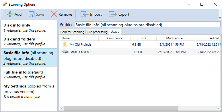 On this page you can see the list of disks and folders that use the selected set of the scanning options.