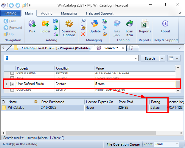 If you want to use values stored in User-Defined Fields when searching, you should mark the penultimate row of the additional search options named after the Header value of your fields ("User Defined Fields", by default, or "Details" in the example above). Then type a part of the string to search, and click Search. The additional search options work as filters. First, WinCatalog finds all entries matching the search query entered into the Search field (on top), and then it filters results according to these additional search options.